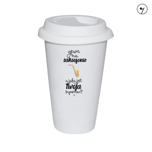 Kubki typu tumbler posiadają podwójną ściankę zapewniającą doskonałą izolację termiczną napojów, zarówno gorących jak i zimnych. Kubek wyposażony jest w wieczko zapobiegające rozlewaniu się napoju np. w samochodzie. Tumbler ze wzorem - Saksofon - Supermoc.