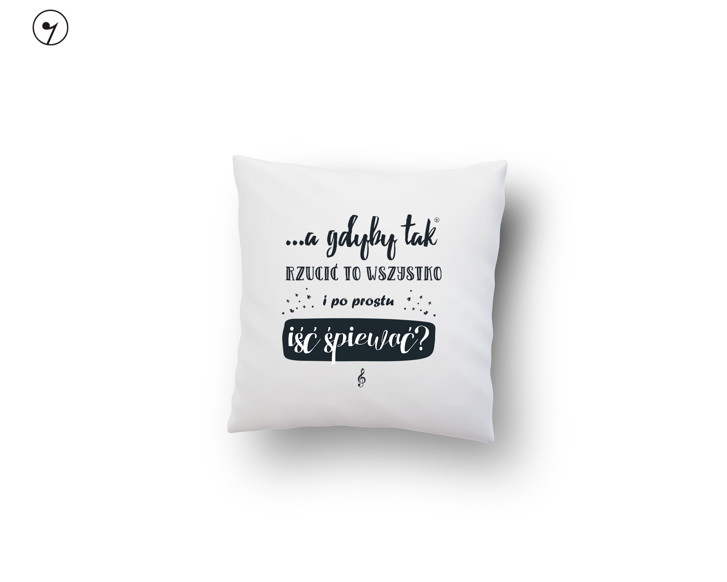 Biała, poduszka dekoracyjna dla muzyka, ze wzorem - "A gdyby tak rzucić to wszystko i po prostu iść śpiewać?".