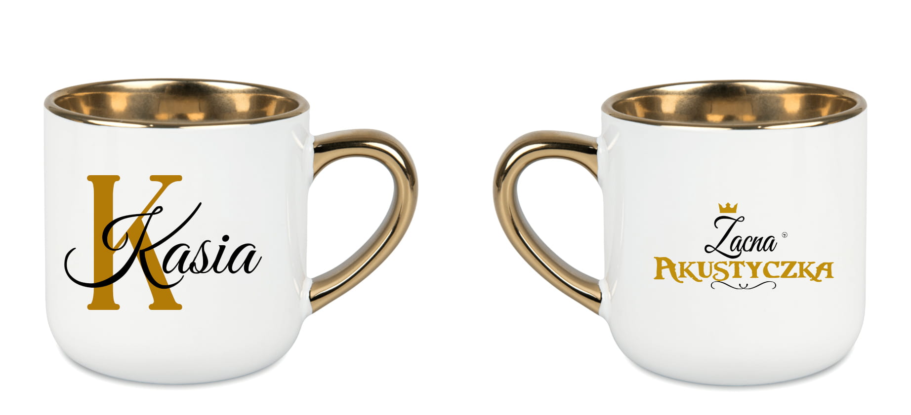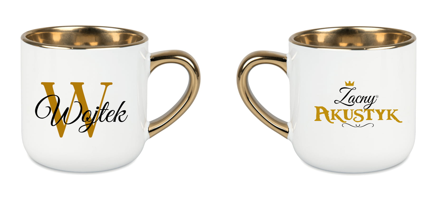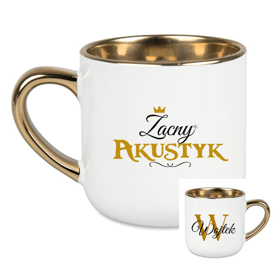 To biały, ceramiczny, elegancki kubek o pojemności 400 ml, ze złotym rantem i uchwytem, dostępny z napisem „Zacna akustyczka” lub „Zacny akustyk” oraz możliwością personalizacji imieniem. Można go dodatkowo zamówić w ozdobnym opakowaniu z kokardą.