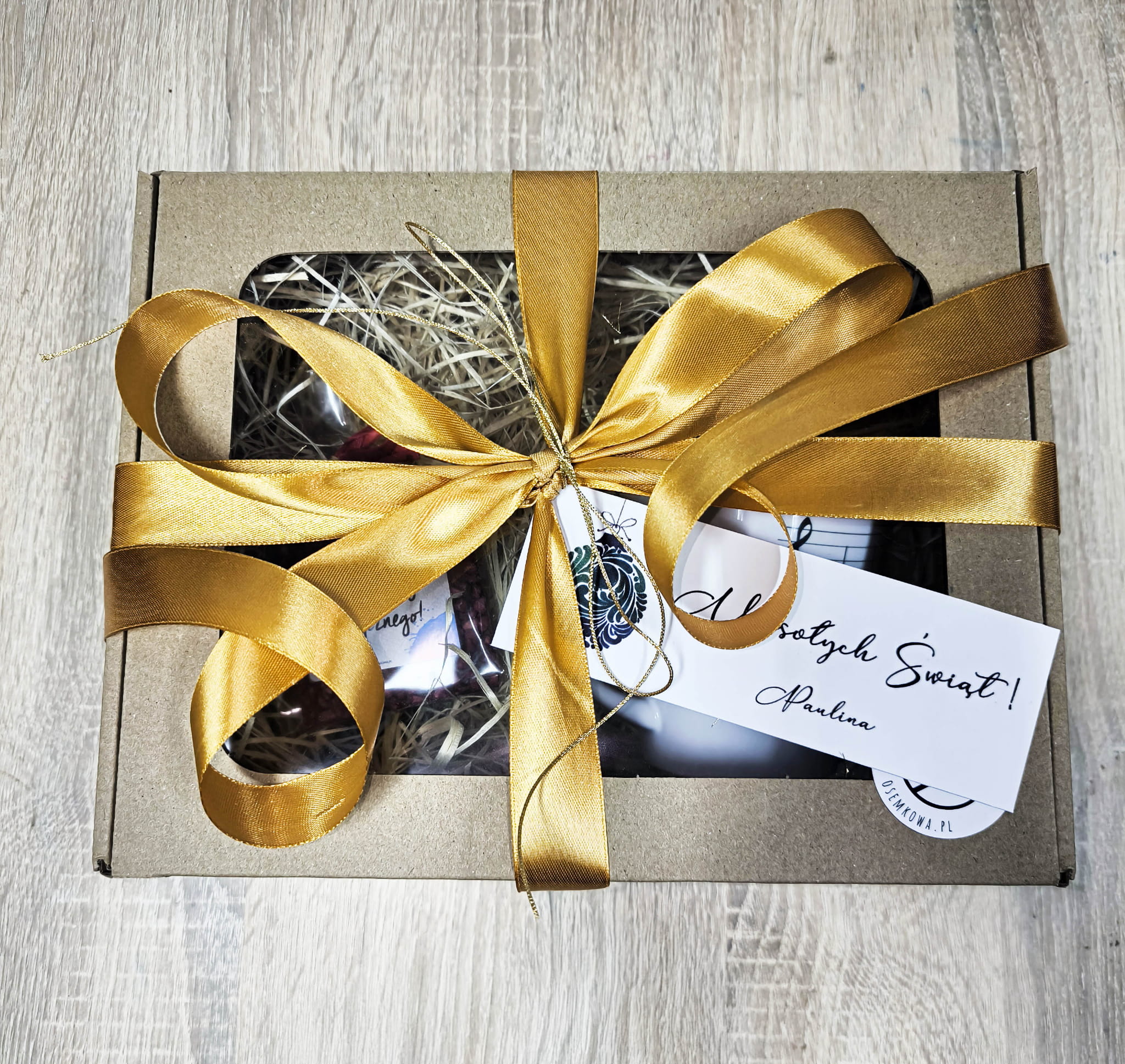 - Opcja pakowania na prezent – możesz wybrać eleganckie pudełko prezentowe z kokardą, także w wariancie z mini czekoladą, dzięki czemu prezent jest gotowy do wręczenia od razu po odebraniu przesyłki.