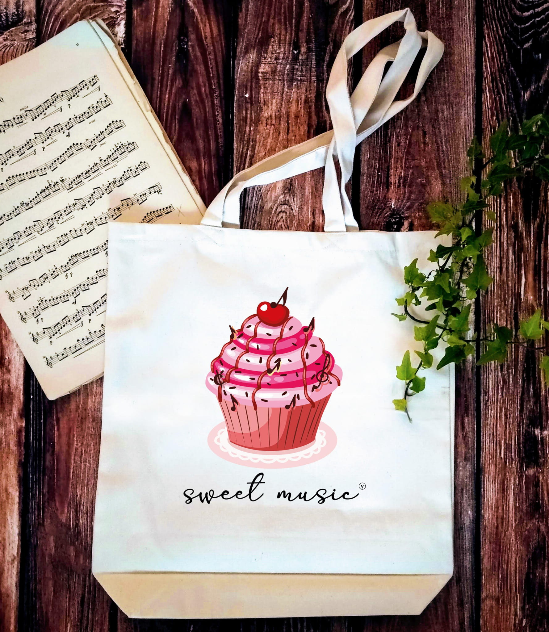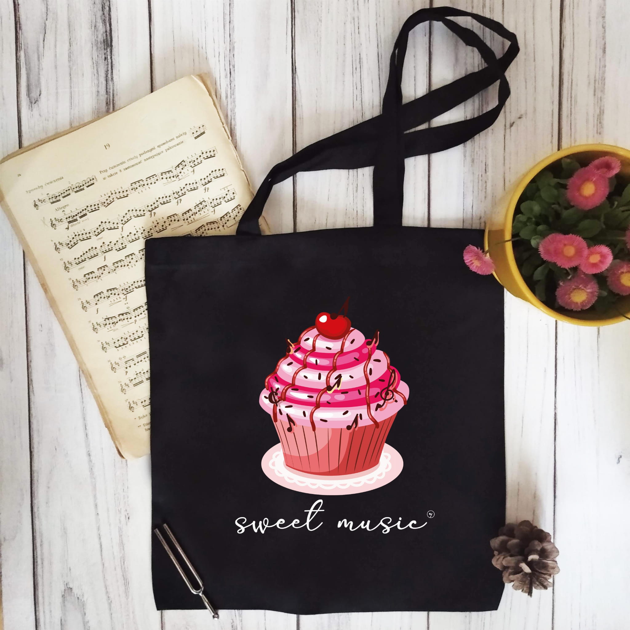 Babeczka - Sweet music. Może się przydać również na zakupy czy też ciężką teczkę z racji na mocny materiał (to znacznie mocniejsza torba, niż zwykle są sprzedawane).