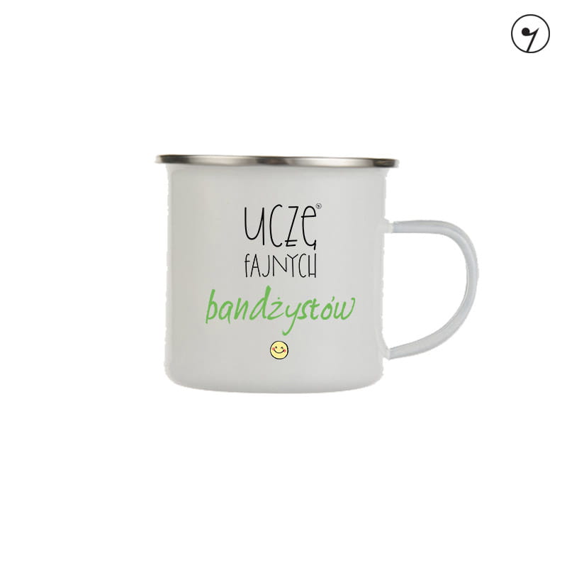 Kubek metalowy, emaliowany z uszkiem. Uczę fajnych bandżystów