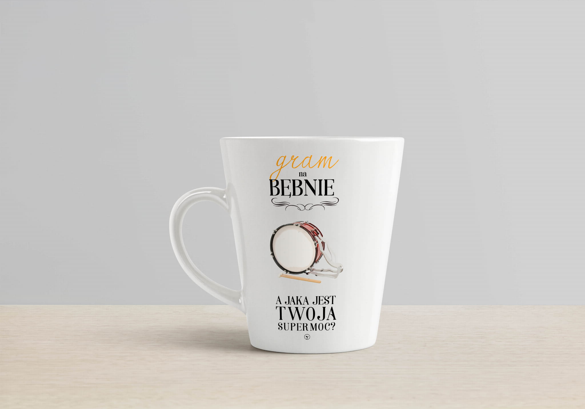 Wzór na kubku - "Bęben - Gram na bębnie a jaka jest Twoja supermoc? - Perkusistka - Perkusista - Prezent dla perkusisty - Kubek latte".