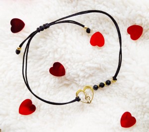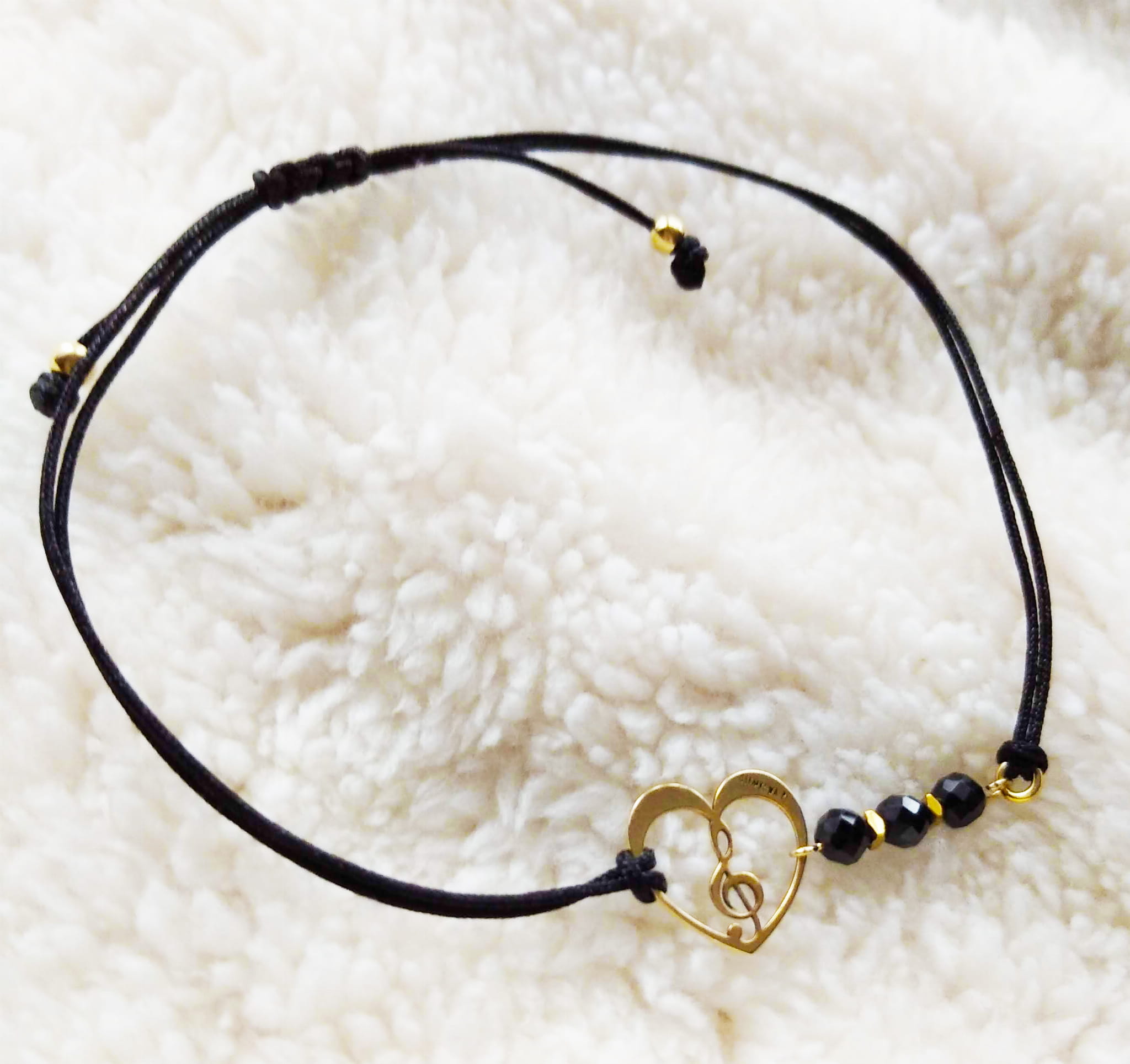 Bransoletka muzyczna „Klucz wiolinowy w sercu” – czarny sznureczek z spinelem