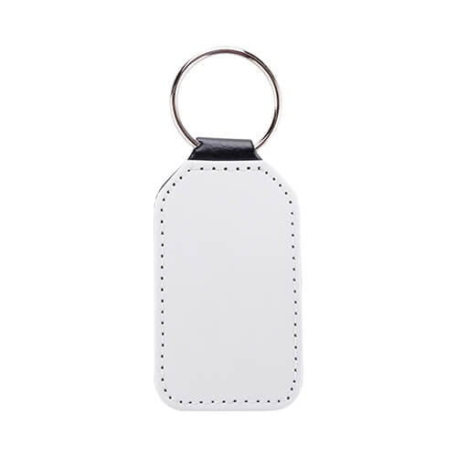 Brelok z ekoskóry. Strona do wykonywania nadruku w kolorze białym, druga strona w kolorze czarnym. Brelok z metalowym, chromowanym kółkiem na klucze.