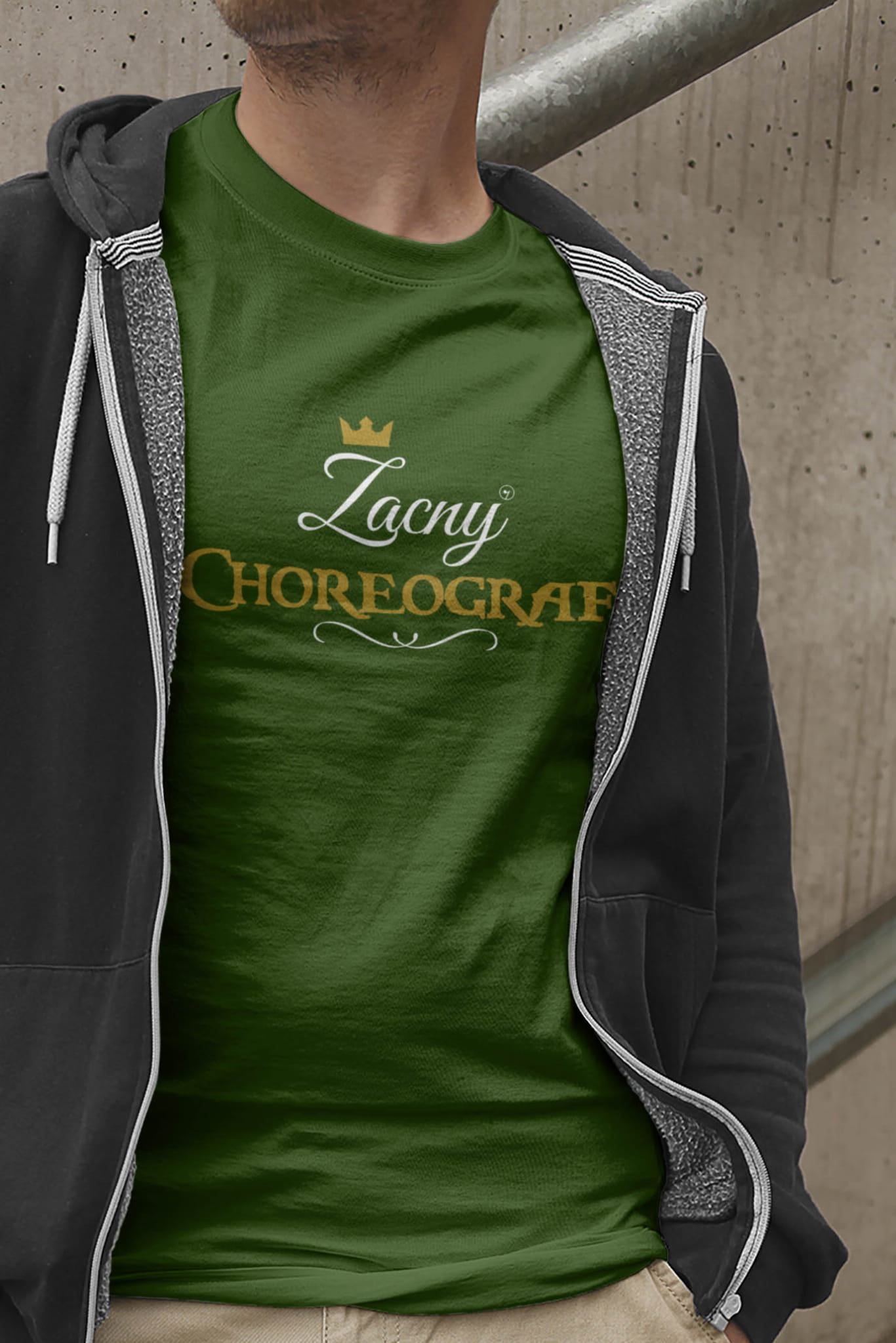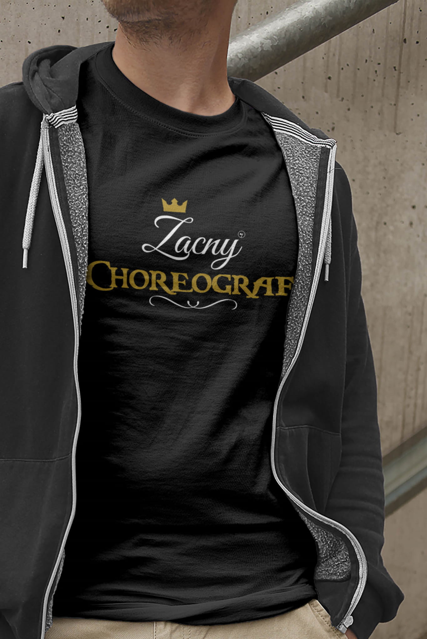 Koszulka „Zacny choreograf / Zacna choreografka” ma z przodu ozdobny napis ze złotą koroną i czarnym ornamentem. Wygląda elegancko, ma charakter i nie jest „śmieszna na siłę”. Wybierasz wersję napisu: „Zacny choreograf” lub „Zacna choreografka” i masz gotowy upominek dla choreografa, który serio będzie noszony. Wzór jest autorstwa Pauliny Strejczek-Jaźwińskiej.