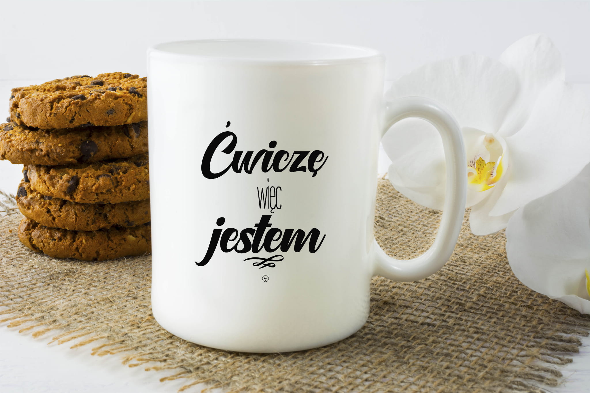 Wzór na kubku - "Ćwiczę więc jestem".