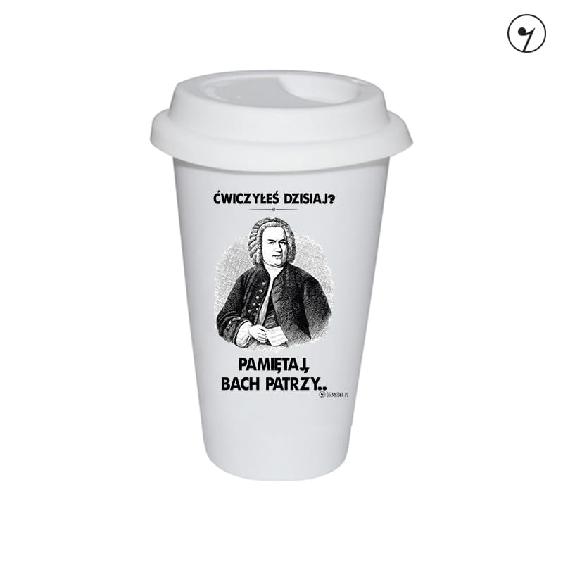 Kubek termiczny ceramiczny ze wzorem "Ćwiczyłeś dzisiaj? Pamiętaj Bach patrzy".
