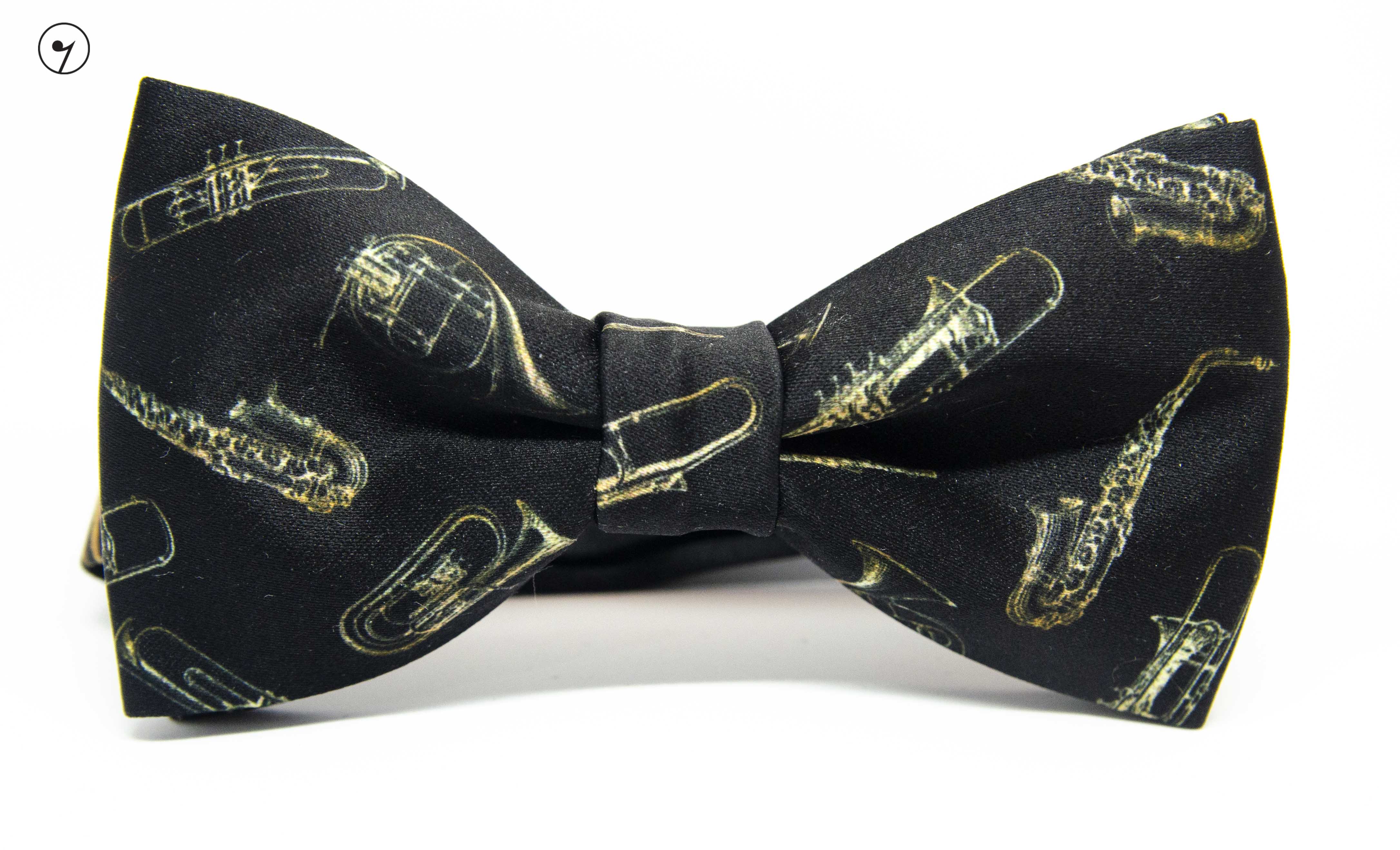 Czarna mucha ze złotymi instrumentami - Saksofon, trąbka Na pasku logo Osemkowa.pl.