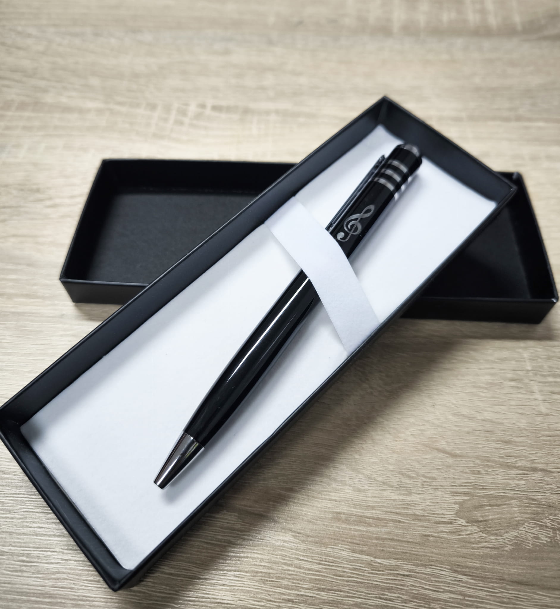 Wysokiej jakości metalowy długopis pakowany w ozdobne pudełko z kluczem wiolinowym wykonanym grawerem.