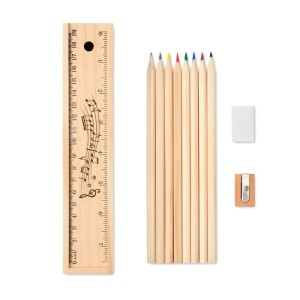 Zestaw zawiera 6 kredek, 2 ołówki, 1 temperówkę, 1 gumkę oraz linijkę służącą jako pokrywka do drewnianego piórnika.