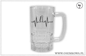 Nadruk czarny, kufel przezroczysty. Lubi mycie ręczne ale raczej nie gardzi też zmywarką.