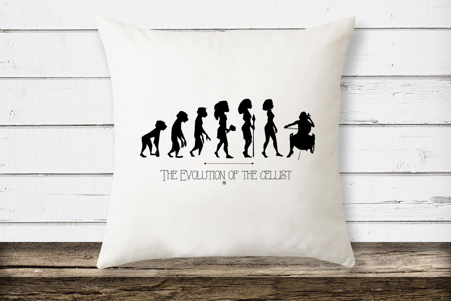 Biała poduszka z wzorem przedstawiającym ewolucję do wiolonczelistki.