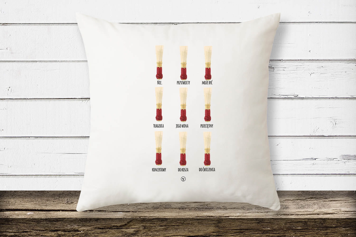 Biała poduszka z miękkiej mikrofibry. Fagot - stroiki fagotu.