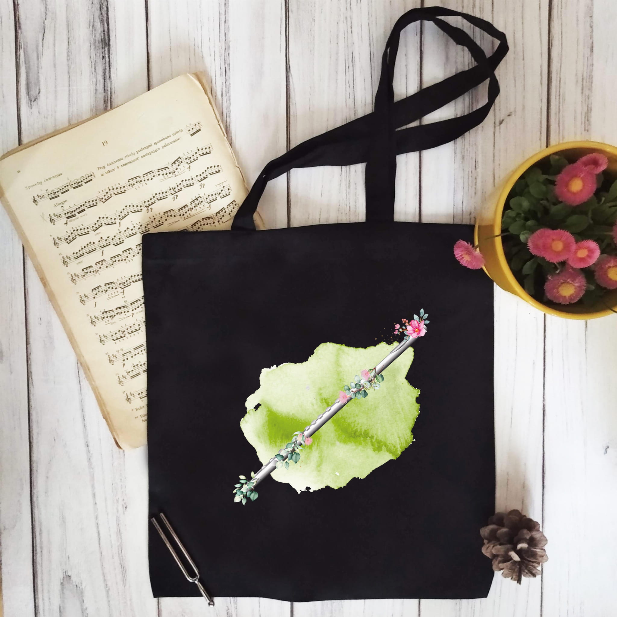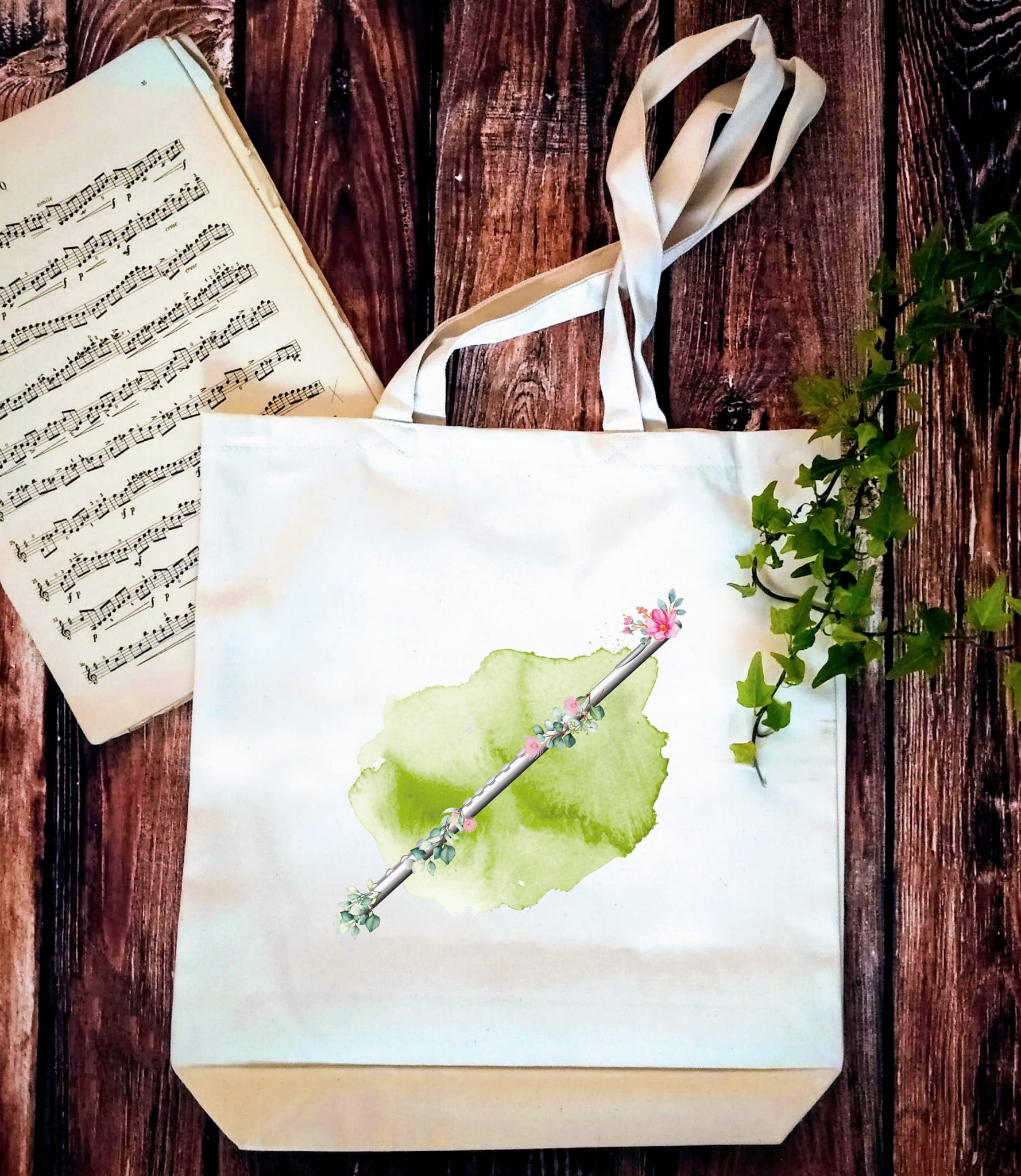 Torba na nuty i inne muzyczne szpargały. Może się przydać również na zakupy czy też ciężką teczkę z racji na mocny materiał (to znacznie mocniejsza torba, niż zwykle są sprzedawane). Z fletem.