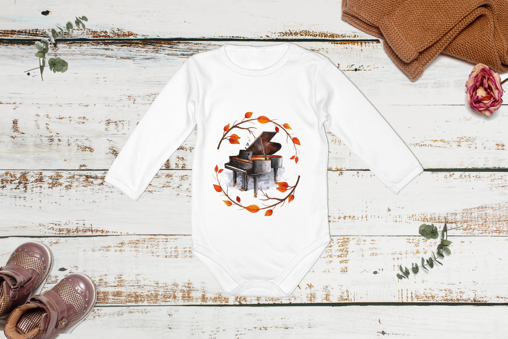 Body z krótkim i długim rękawem, wykonane z 100%- procentowej, miękkiej dzianiny bawełnianej. Fortepian z motywem jesieni.