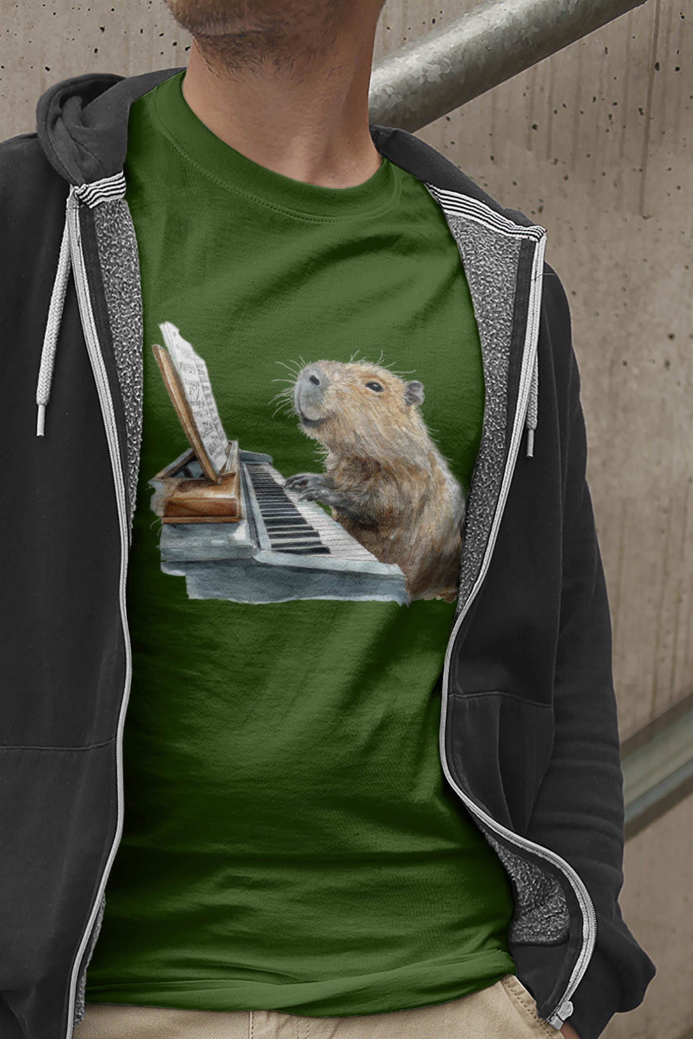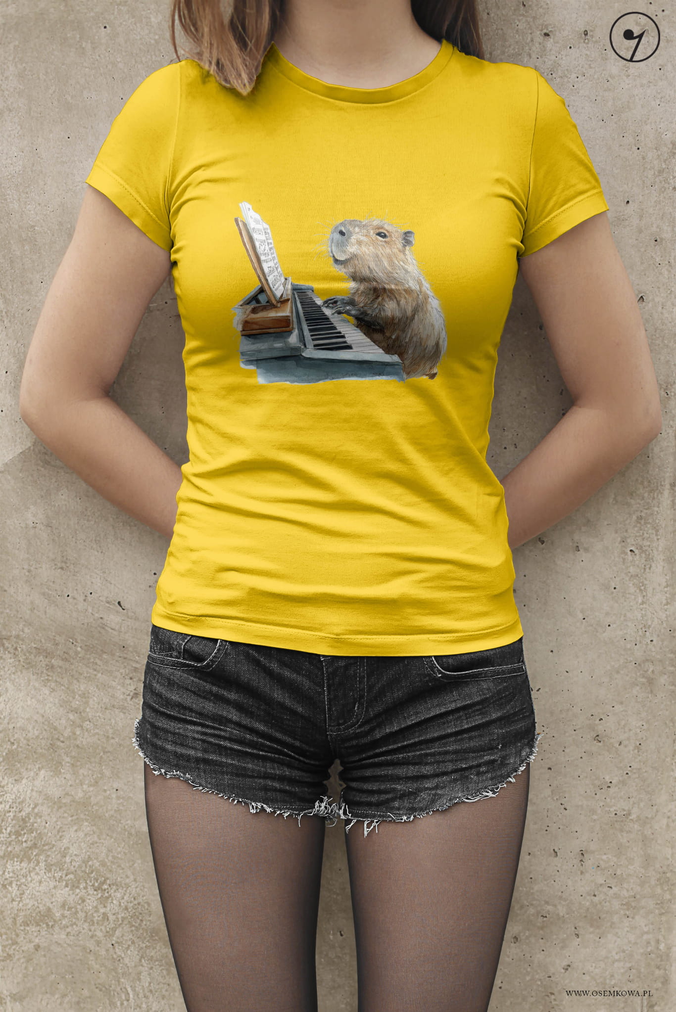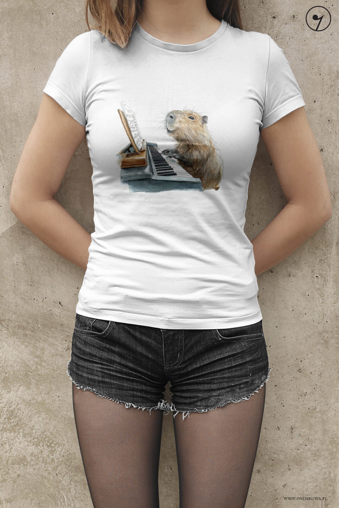 Kapibara grająca na fortepianie. Prosty, zabawny motyw: fortepian, granie, muzyka. Koszulka z humorem, ale wciąż estetyczna i do noszenia na co dzień.