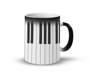 Kubek zmienia kolor z czarnego na biały pod wpływem wysokiej temperatury, ujawniając grafikę klawiszy fortepianu.