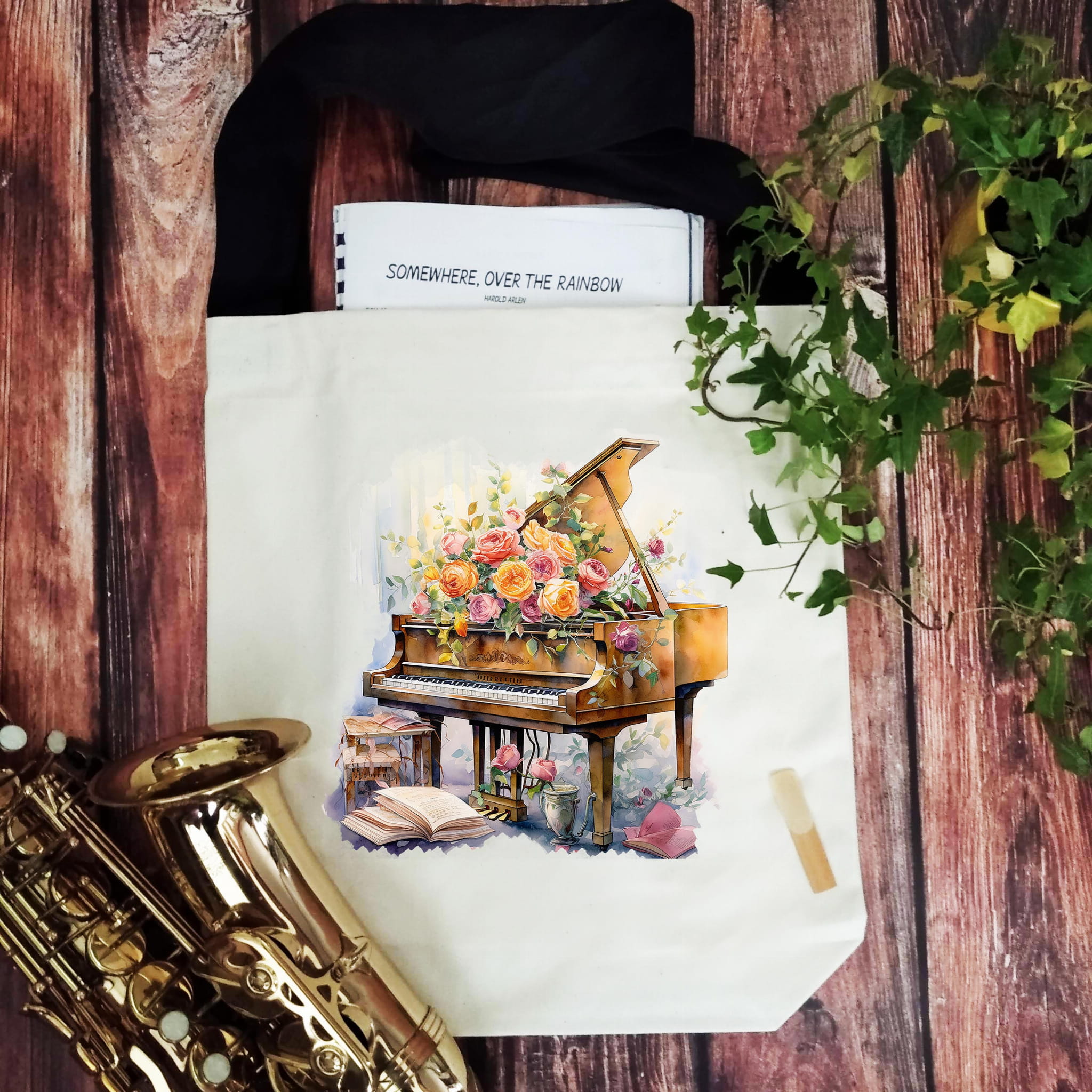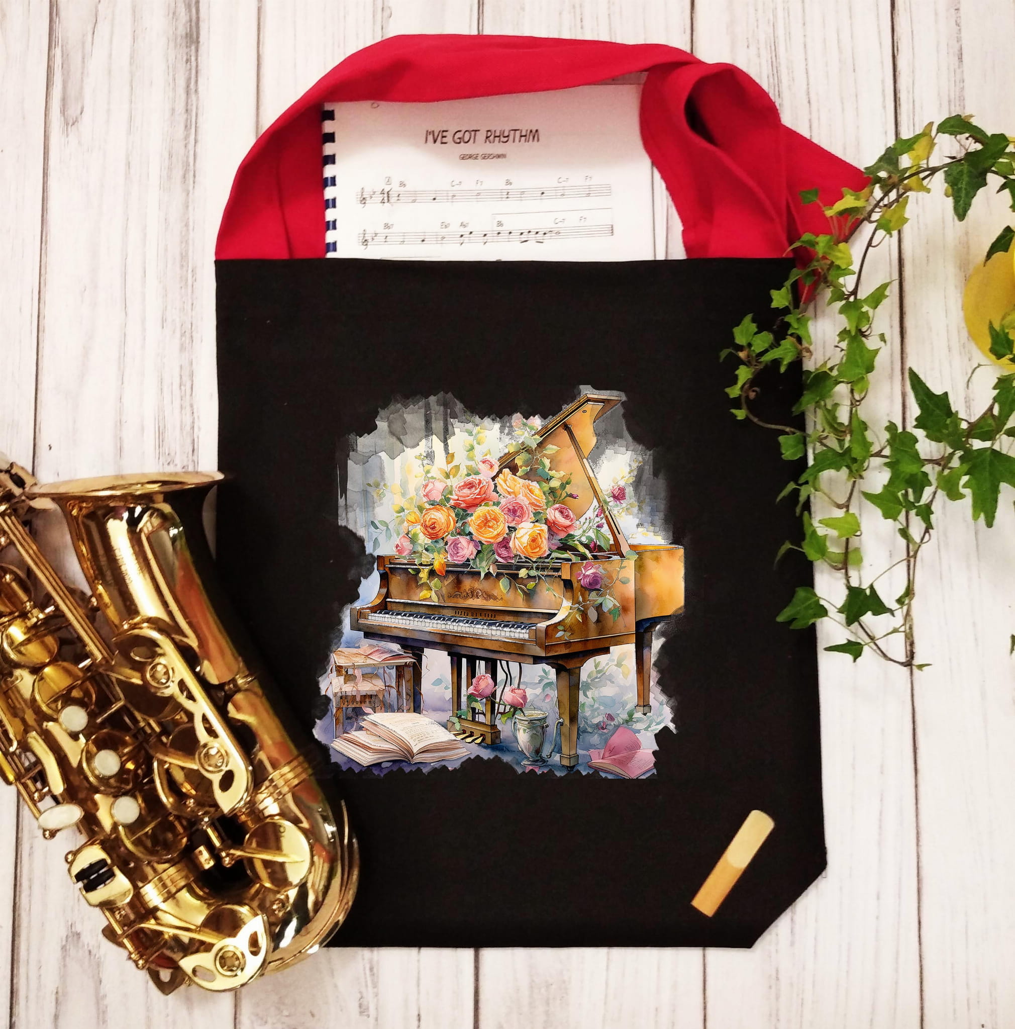 Torba muzyczna, fortepian w różach.