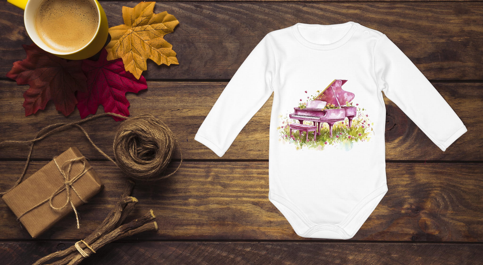Body z krótkim i długim rękawem, wykonane z 100%- procentowej, miękkiej dzianiny bawełnianej. Różowy fortepian.