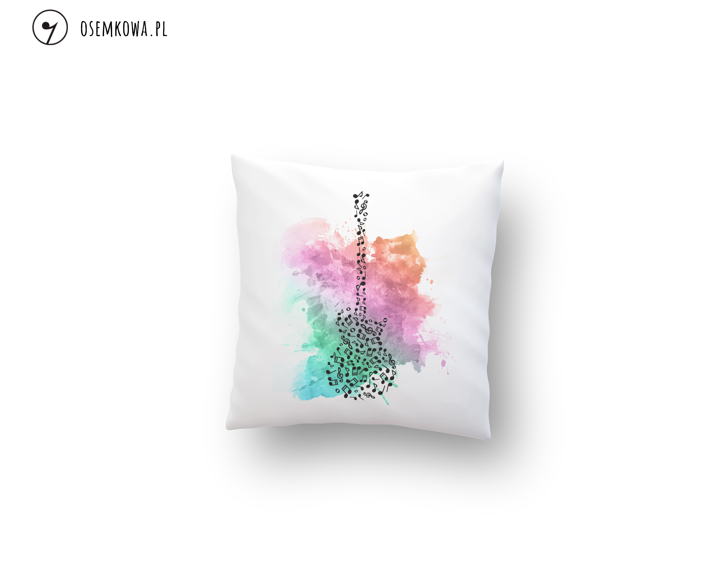 To poduszka dla gitarzysty z motywem gitary i nut, która łączy dekoracyjny charakter z codziennym komfortem użytkowania.