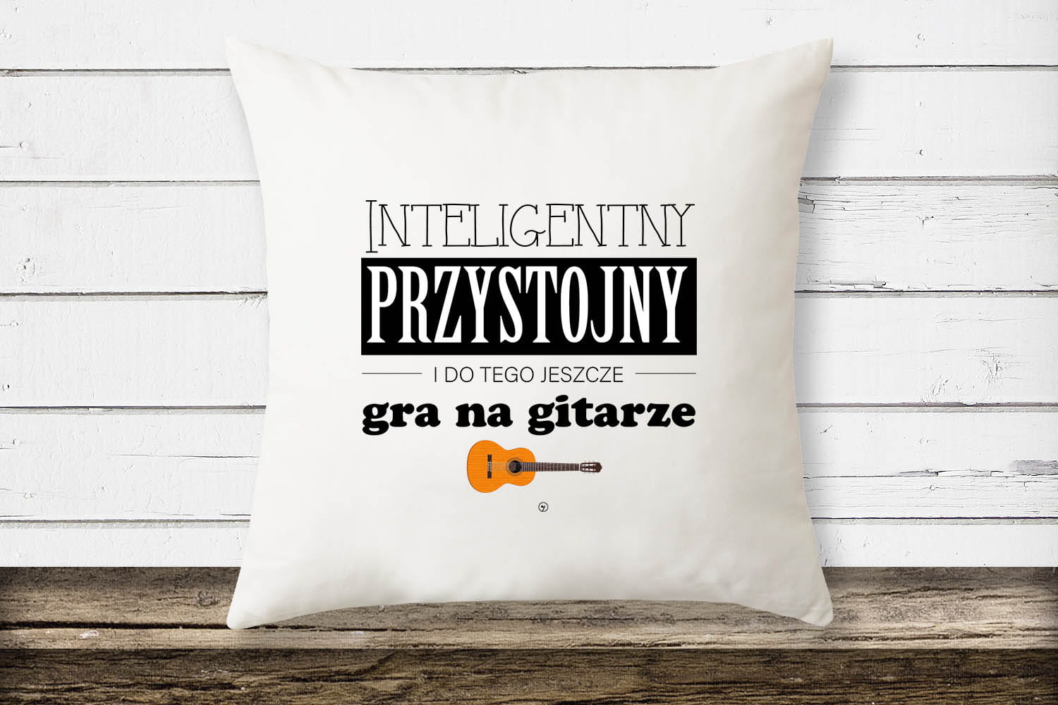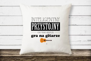 Biała poduszka z wzorem - Inteligentny Przystojny i do tego jeszcze gra na gitarze.
