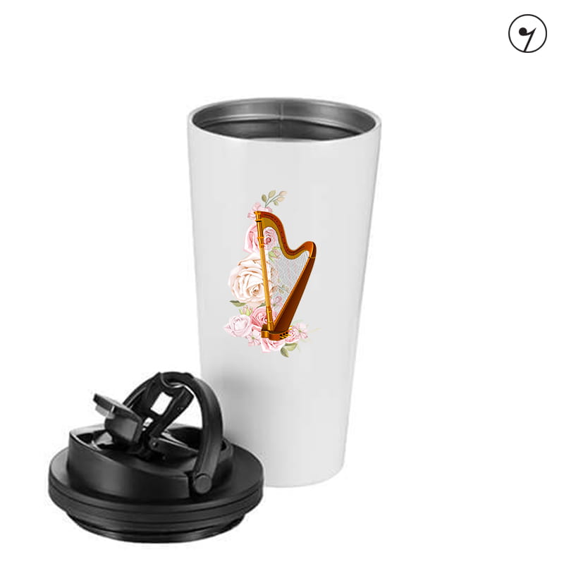 Kubek dla muzyka który woli mieć swoją kawę lub herbatę ciepłą przez dłuższy czas. Z harfą.