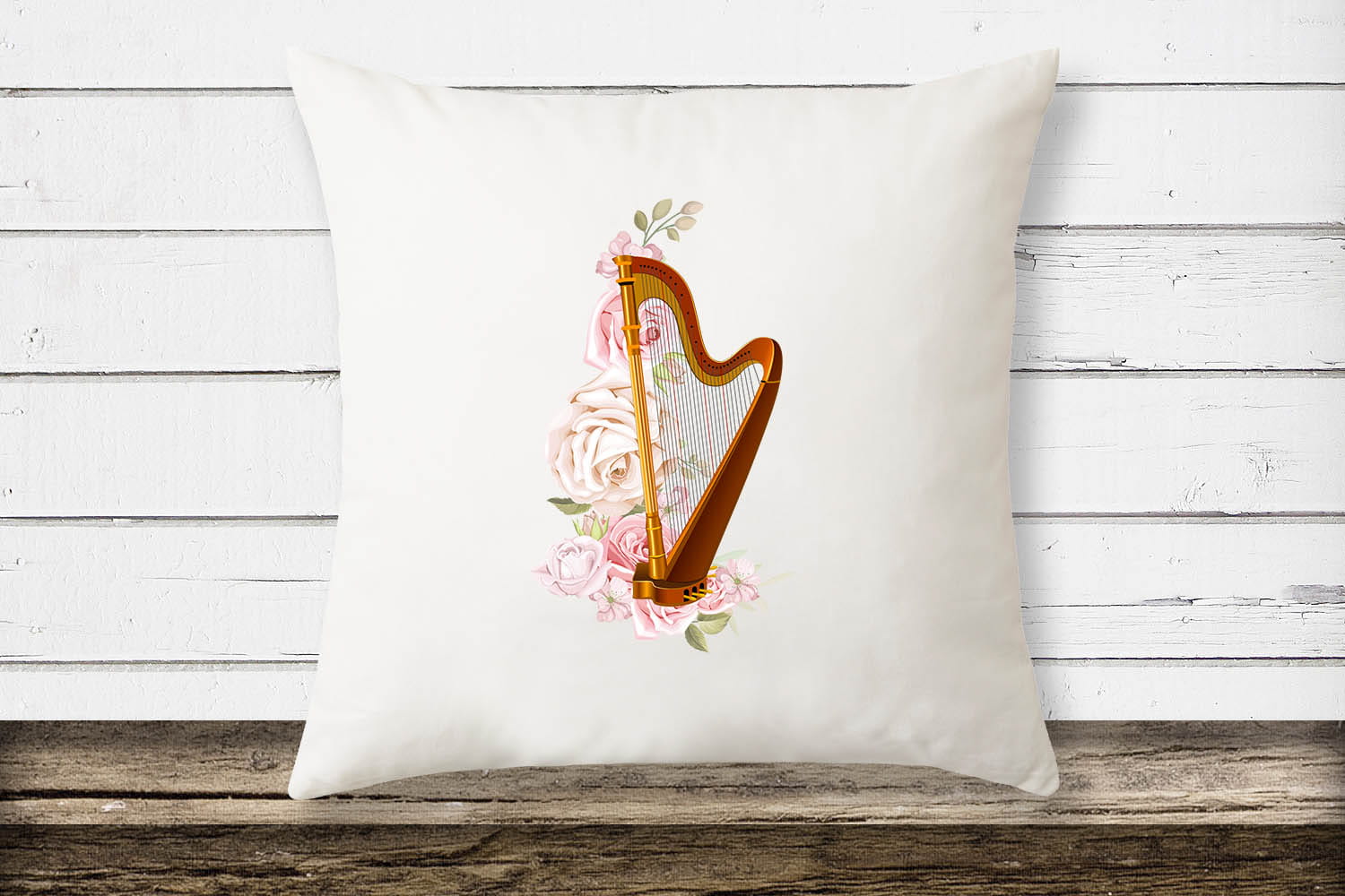 Biała poduszka z miękkiej mikrofibry z harfą.