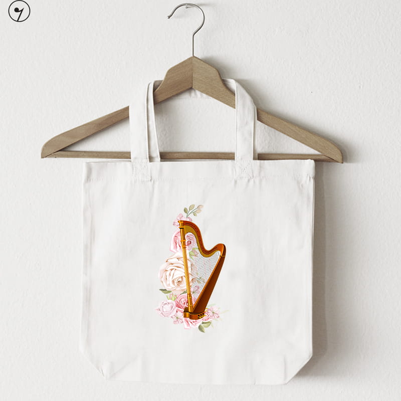Torba na nuty i inne muzyczne szpargały z harfą. Może się przydać również na zakupy czy też ciężką teczkę z racji na mocny materiał (to znacznie mocniejsza torba, niż zwykle są sprzedawane).