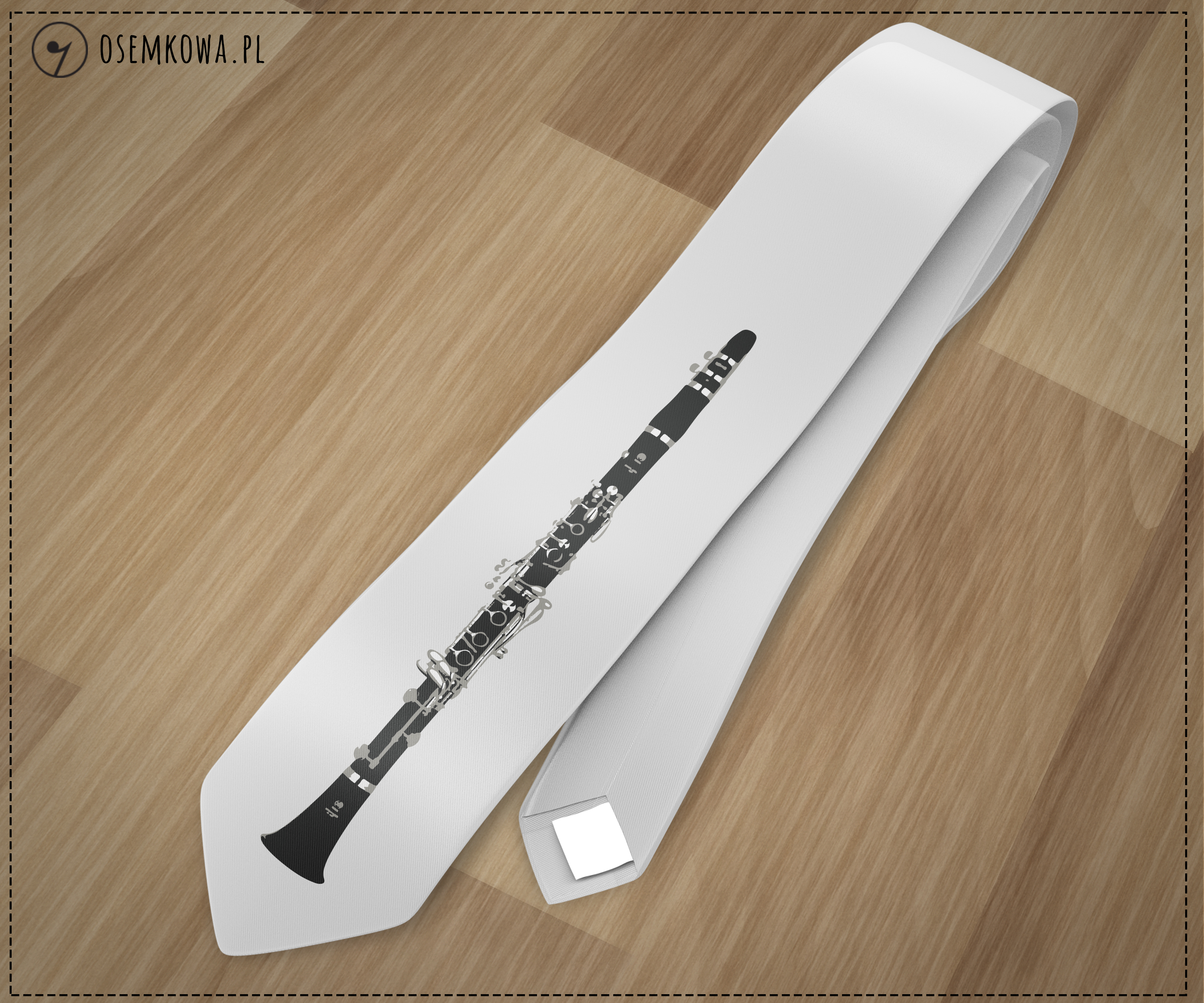 Elegancki biały krawat, z klarnetem.