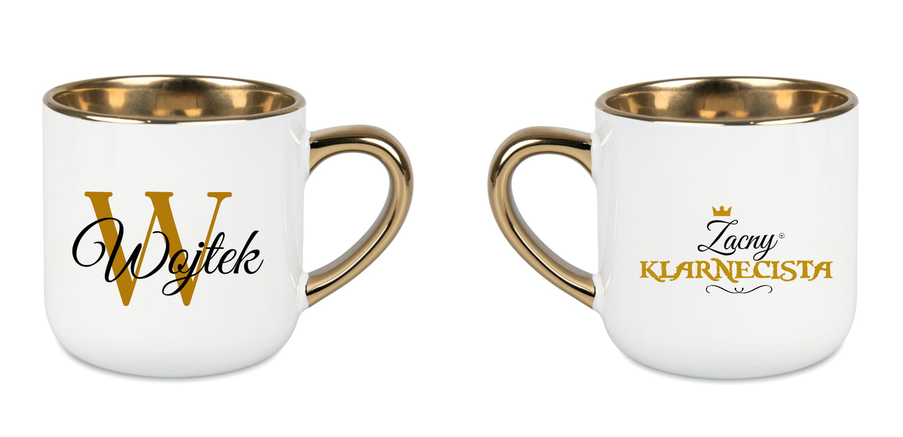 To biały, ceramiczny, elegancki kubek o pojemności 400 ml, ze złotym rantem i uchwytem, dostępny z napisem „Zacna klarnecistka” lub „Zacny klarnecista” oraz możliwością personalizacji imieniem. Można go dodatkowo zamówić w ozdobnym opakowaniu z kokardą.