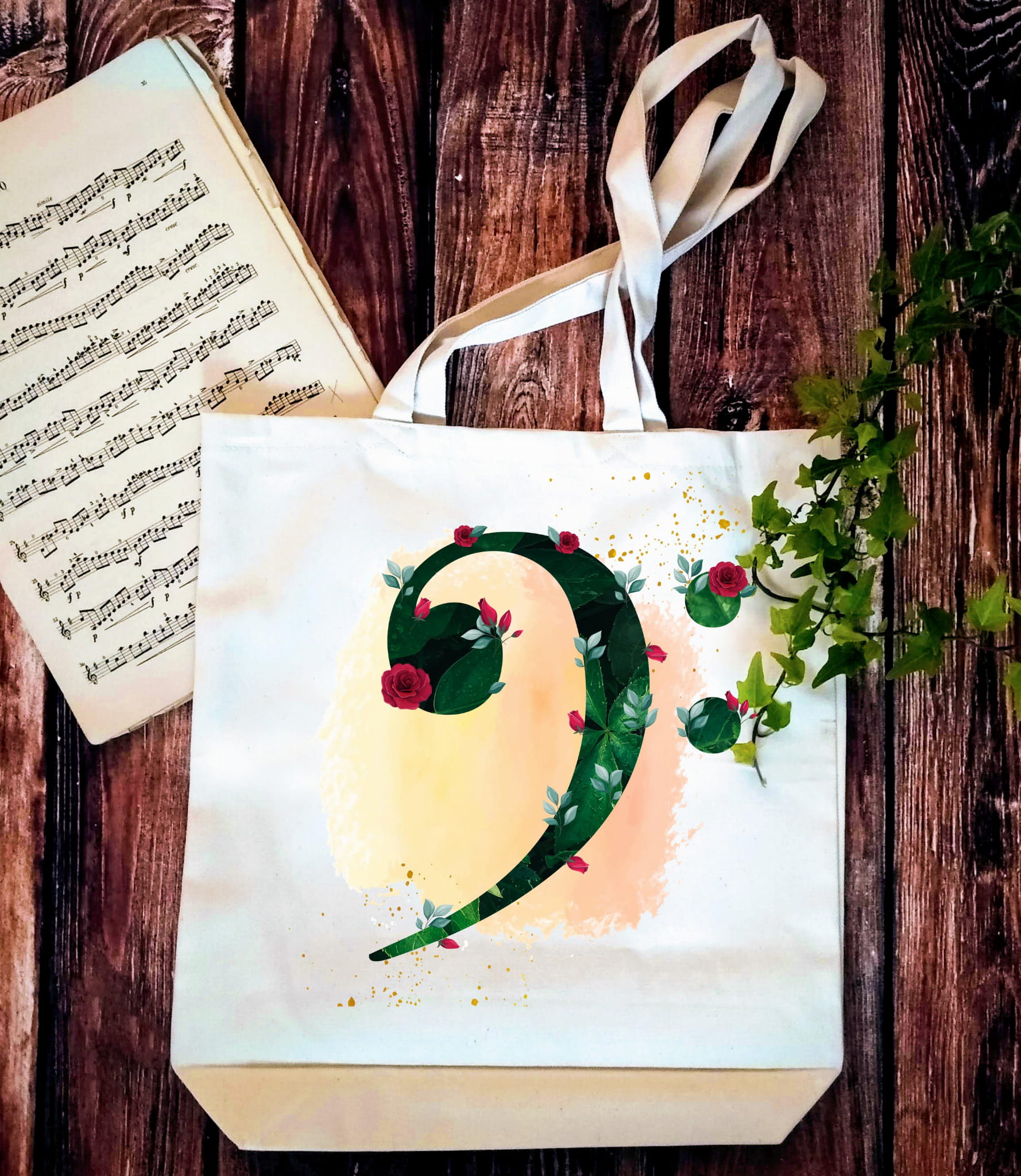 Torba na nuty i inne muzyczne szpargały. Może się przydać również na zakupy czy też ciężką teczkę z racji na mocny materiał (to znacznie mocniejsza torba, niż zwykle są sprzedawane). Klucz basowy - Róże - Torba 2 ucha