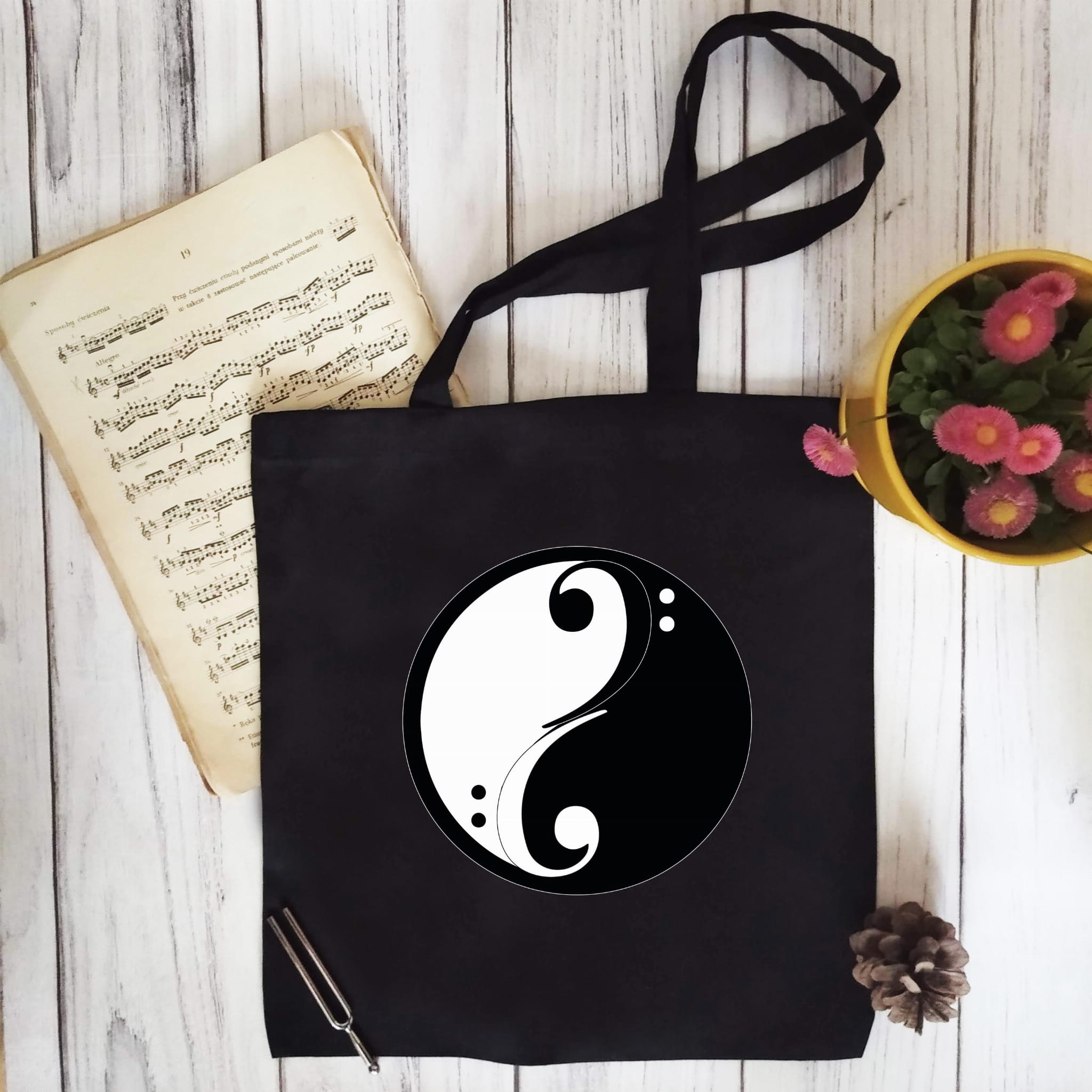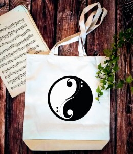 Torba na nuty i inne muzyczne szpargały. Może się przydać również na zakupy czy też ciężką teczkę z racji na mocny materiał (to znacznie mocniejsza torba, niż zwykle są sprzedawane). Klucz basowy - yin i yang