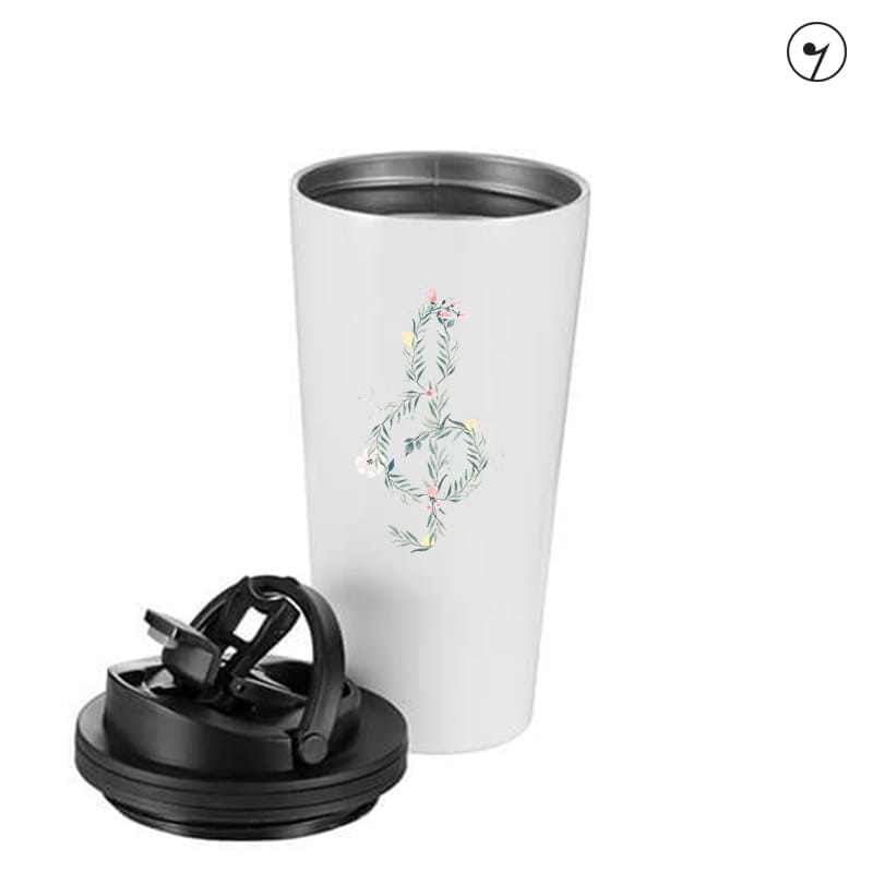 Kubek dla muzyka który woli mieć swoją kawę lub herbatę ciepłą przez dłuższy czas. Klucz wiolinowy w liściach.