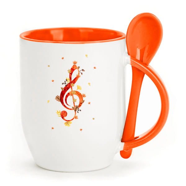 Klucz wiolinowy - Liście - Kubek z łyżeczką - Jesień - Pomarańczowy