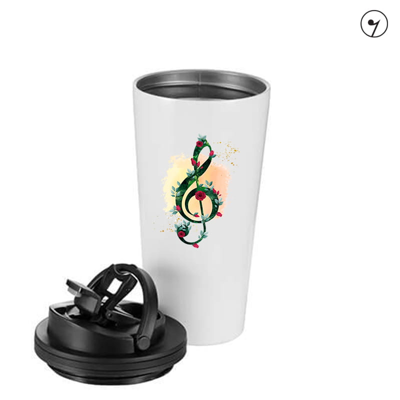 Kubek dla muzyka który woli mieć swoją kawę lub herbatę ciepłą przez dłuższy czas. Klucz w różach.