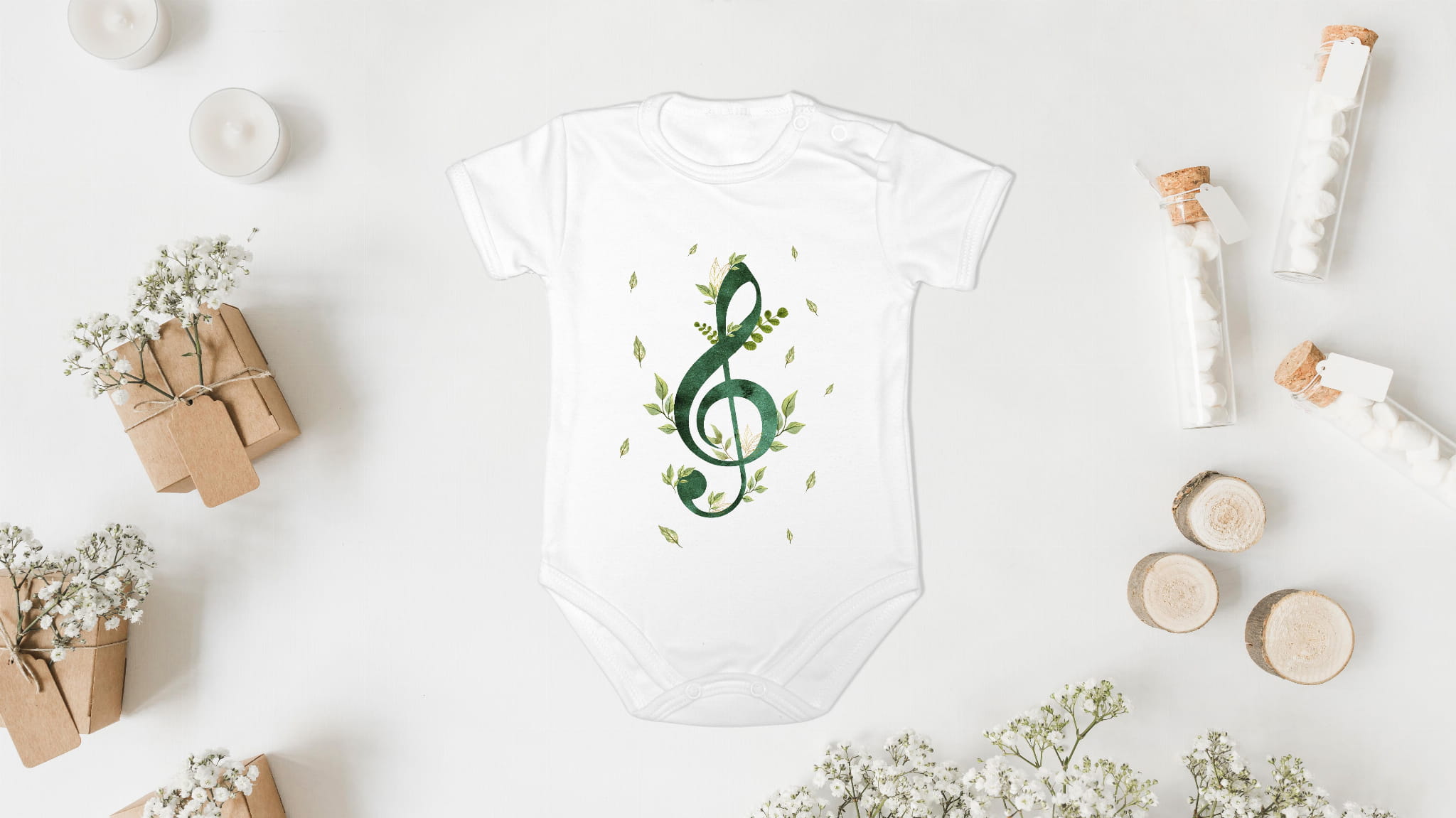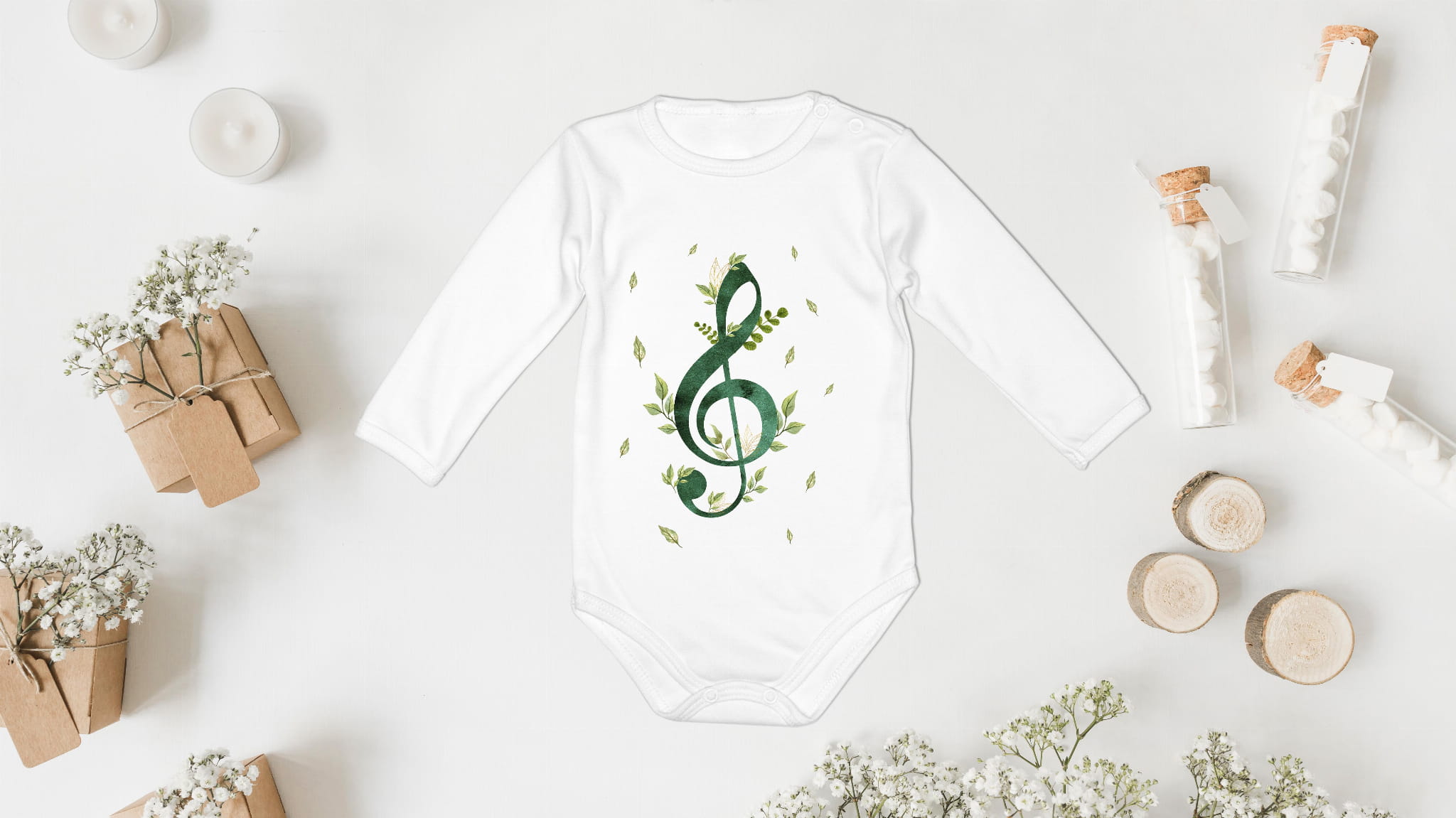 Body z krótkim i długim rękawem, wykonane z 100%- procentowej, miękkiej dzianiny bawełnianej w całości wykonane zostało w Polsce. Klucz wiolinowy - kwiaty.