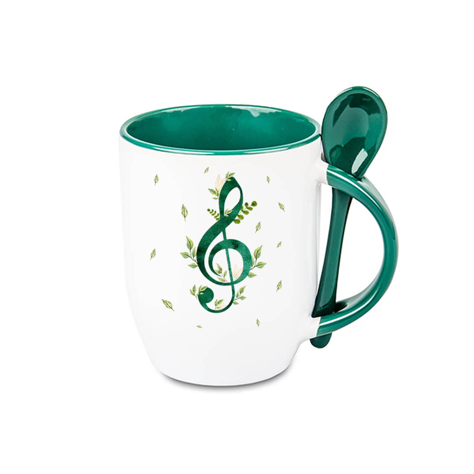 Kubek o kolorze butelkowej zieleni, z łyżeczką, z wiosennym nadrukiem w liście i klucz wiolinowy.