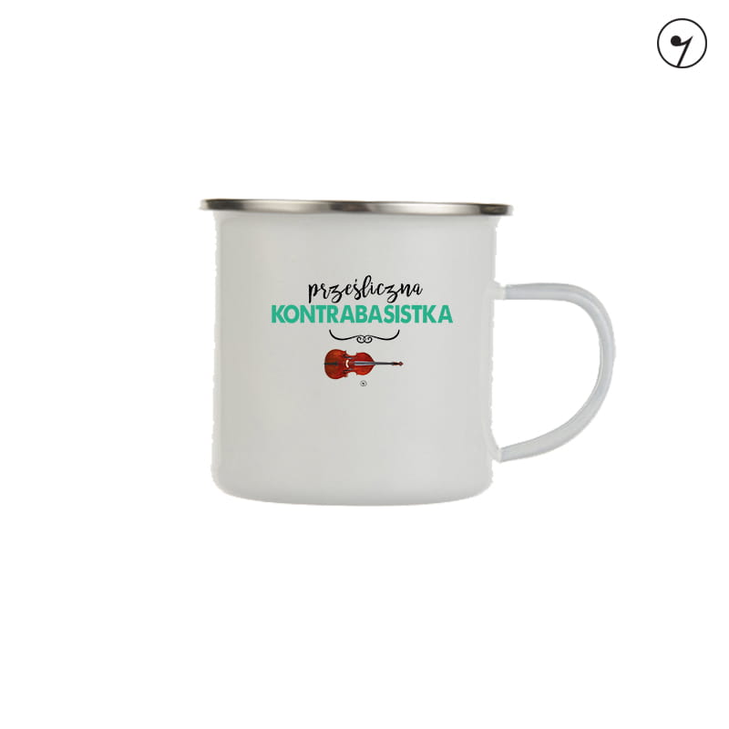 Emaliowany kubek muzyczny, który jest super prezentem dla każdej kontrabasistki. Kubki o pojemność 300 ml. Kubek koloru białego ze srebrnym rantem, metalowy, emaliowany z uszkiem. Idealnie nadaje się na nietypowy prezent walentynkowy dla kontrabasistki.