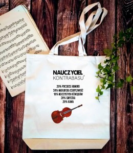 Torba na nuty i inne muzyczne szpargały z kontrabasem. Może się przydać również na zakupy czy też ciężką teczkę z racji na mocny materiał (to znacznie mocniejsza torba, niż zwykle są sprzedawane).