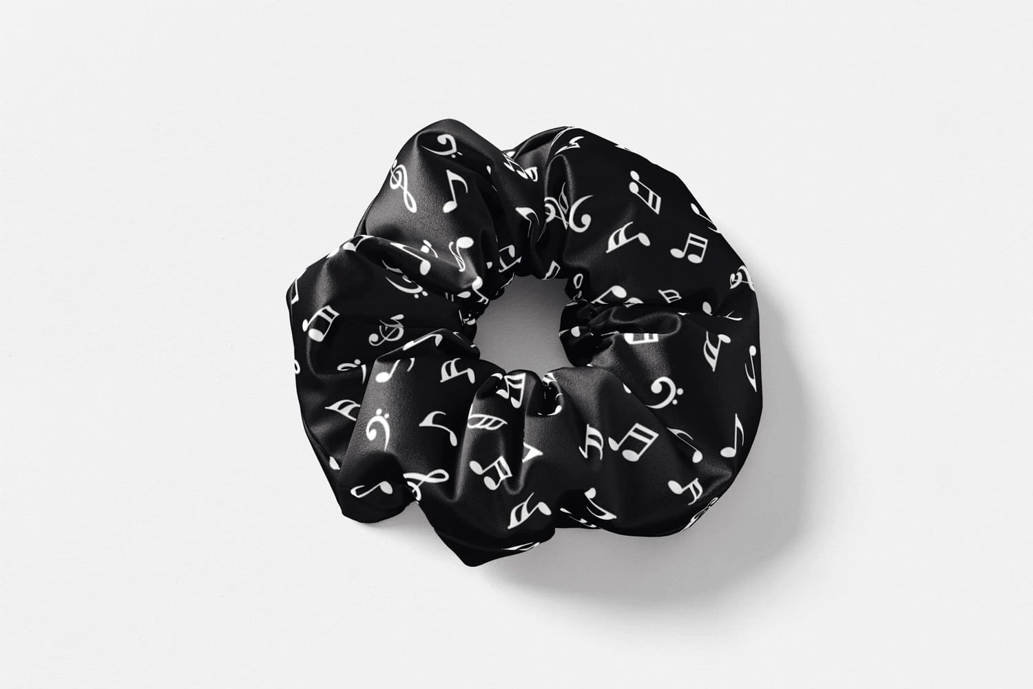 Muzyczna gumka do włosów - Scrunchie - Czarna w białe nutki