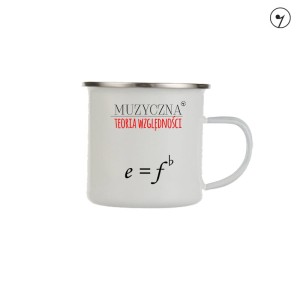 Kubek metalowy, emaliowany z uszkiem. Wzór - "Muzyka - Teoria względności - Muzyczna teoria".