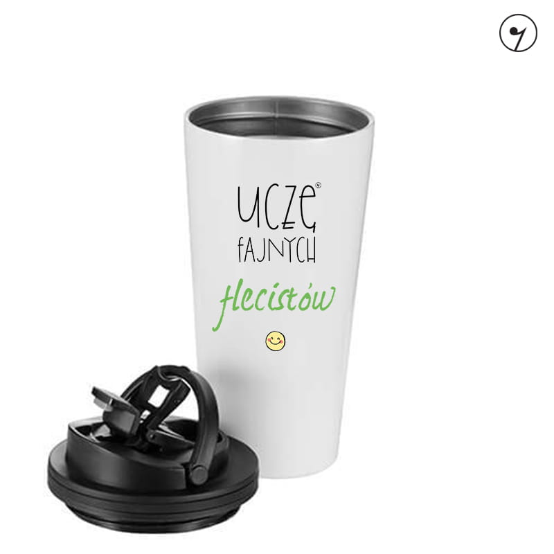 Termiczny kubek muzyczny, który jest super prezentem dla każdego nauczyciela fletu, a w szczególności dla tego, który uczy fajnych flecistów. Kubki termiczne typu tumbler posiadają podwójną ściankę zapewniającą doskonałą izolację termiczną napojów, zarówno gorących jak i zimnych. Kubek dla muzyka który woli mieć swoją kawę lub herbatę ciepłą przez dłuższy czas. Kubek biały z nadrukiem sublimacyjnym, wykonany z metalu, gumy i plastiku, o pojemności 480 ml. Kubek wyposażony jest w praktyczną pokrywkę wzmacnianą gumą, z zamykanym otworem do picia, dzięki czemu zapobiega rozlewaniu się napoju np. w samochodzie.