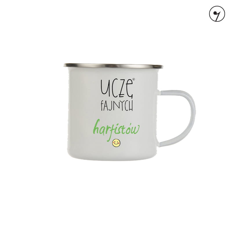 Emaliowany kubek muzyczny, który jest super prezentem dla każdego nauczyciela harfy, a w szczególności dla tego, który uczy fajnych harfistów. Kubki o pojemność 300 ml. Kubek koloru białego ze srebrnym rantem, metalowy, emaliowany z uszkiem.