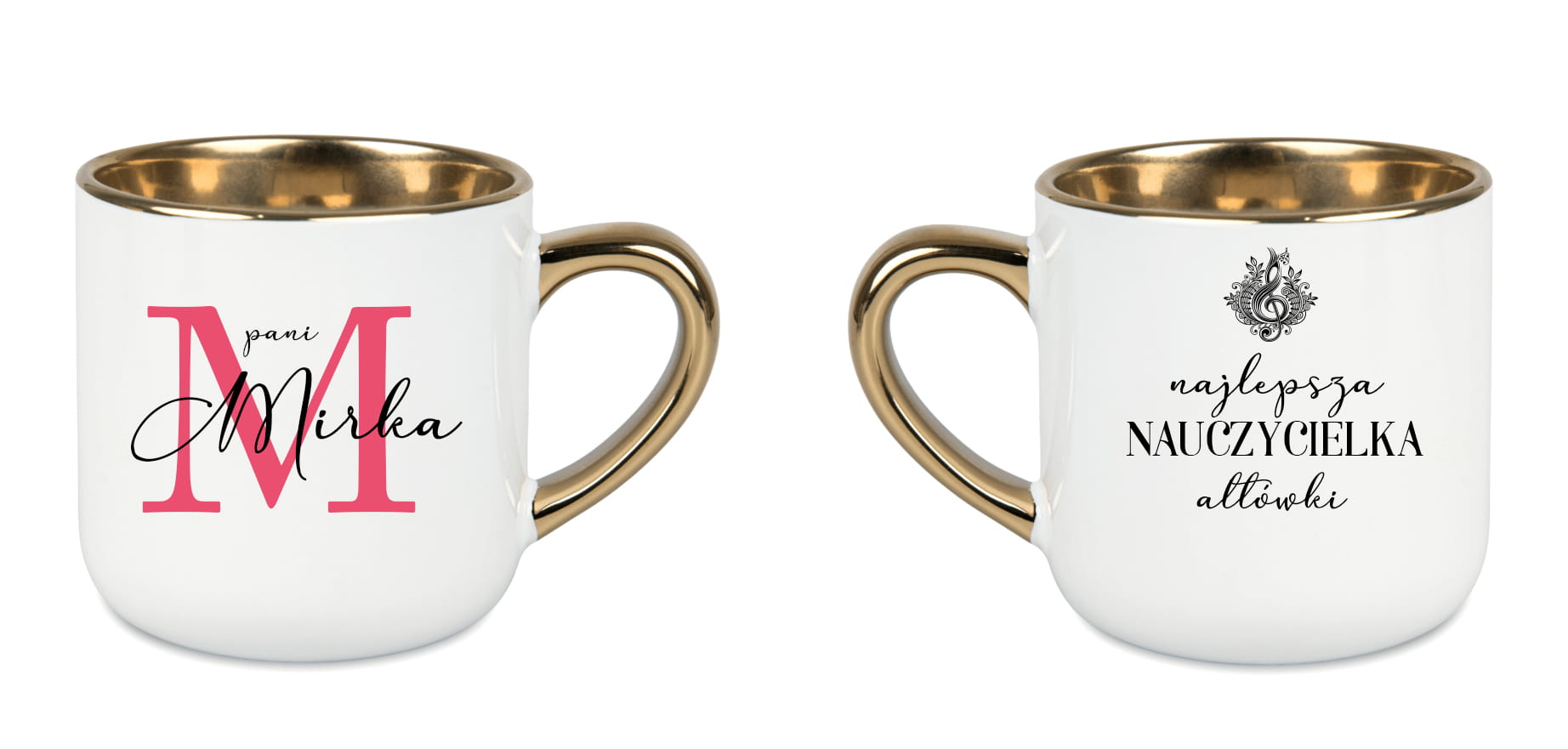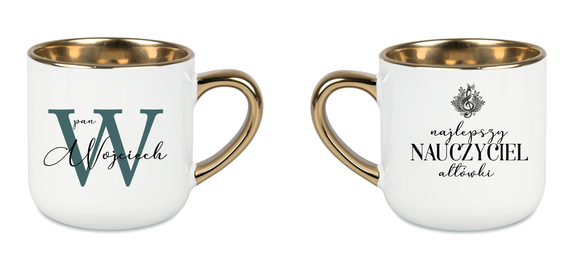 Wzór autorstwa Pauliny Strejczek-Jaźwińskiej przedstawia ozdobny klucz wiolinowy w artystycznym ornamencie, a napis wykonany elegancką czcionką nadaje mu wyjątkowego charakteru. Możliwość personalizacji imieniem lub dedykacją sprawia, że kubek staje się niepowtarzalną pamiątką – idealną na zakończenie roku szkolnego, jubileusz, urodziny czy święta.
