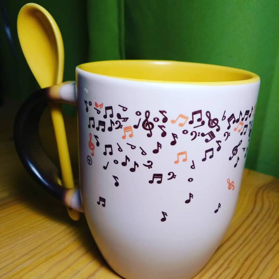 Kubek magiczny, czarny z żółtym wnętrzem i łyżeczką w kolorze żółtym. W nutki.