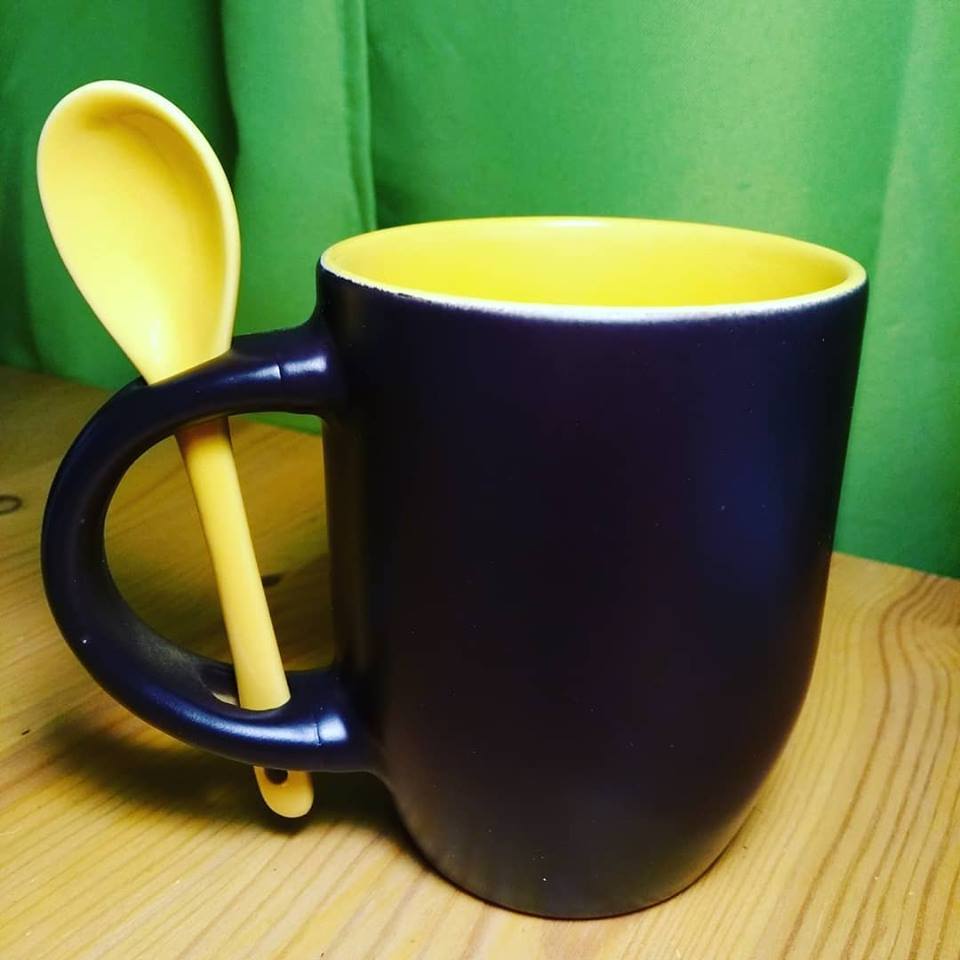 Kubek magiczny, czarny z żółtym wnętrzem i łyżeczką w kolorze żółtym.