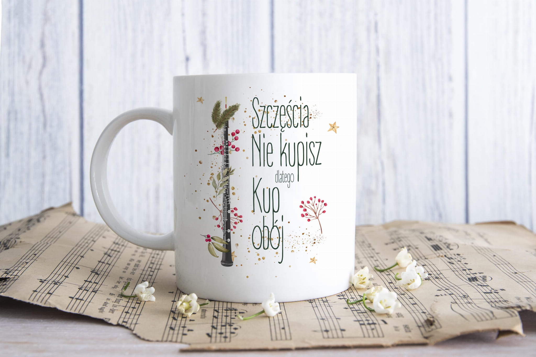 Kubek muzyczny, który jest super prezentem dla każdego oboisty. Wzór - "Obój - Szczęścia nie kupisz kup obój"
