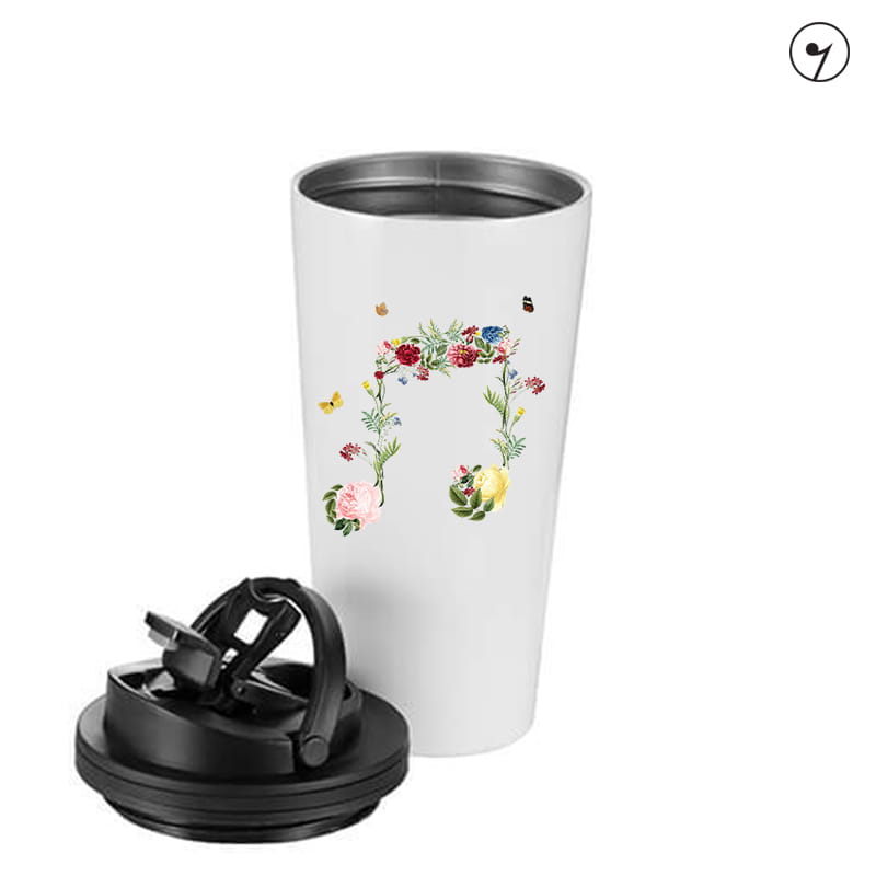 Kubek dla muzyka który woli mieć swoją kawę lub herbatę ciepłą przez dłuższy czas. Wzór: Ósemki wiosna - Kwiaty.