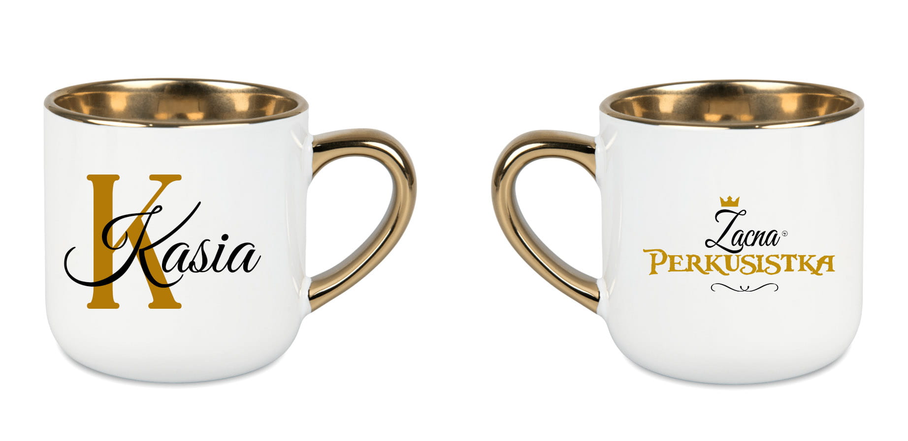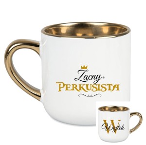 To biały, ceramiczny, elegancki kubek o pojemności 400 ml, ze złotym rantem i uchwytem, dostępny z napisem „Zacna perkusistka” lub „Zacny perkusista” oraz możliwością personalizacji imieniem. Można go dodatkowo zamówić w ozdobnym opakowaniu z kokardą.